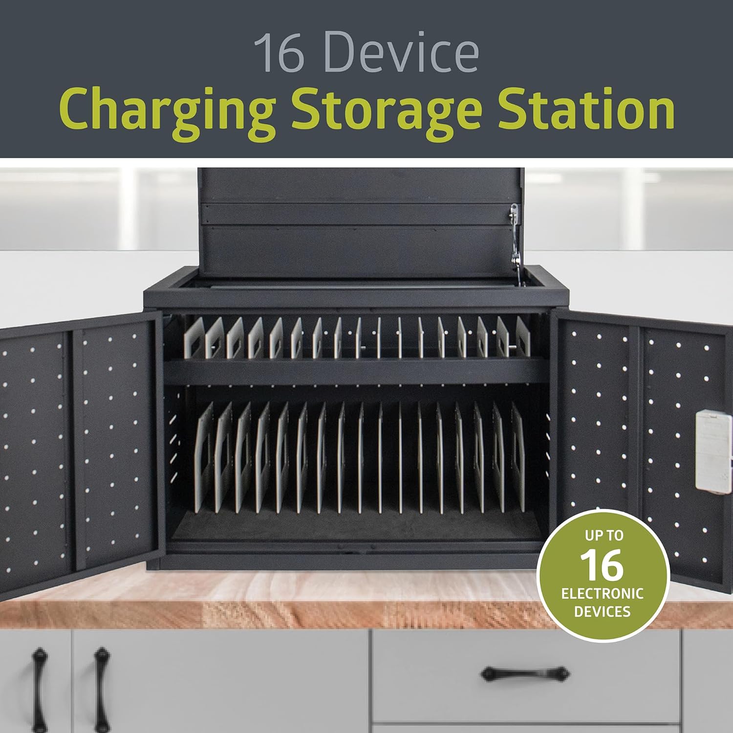 - CHARGE & STORE 16 DEVICES AT ONCE: Store and charge 16 devices at one time, in a secure, space-saving, portable table top charging cabinet
