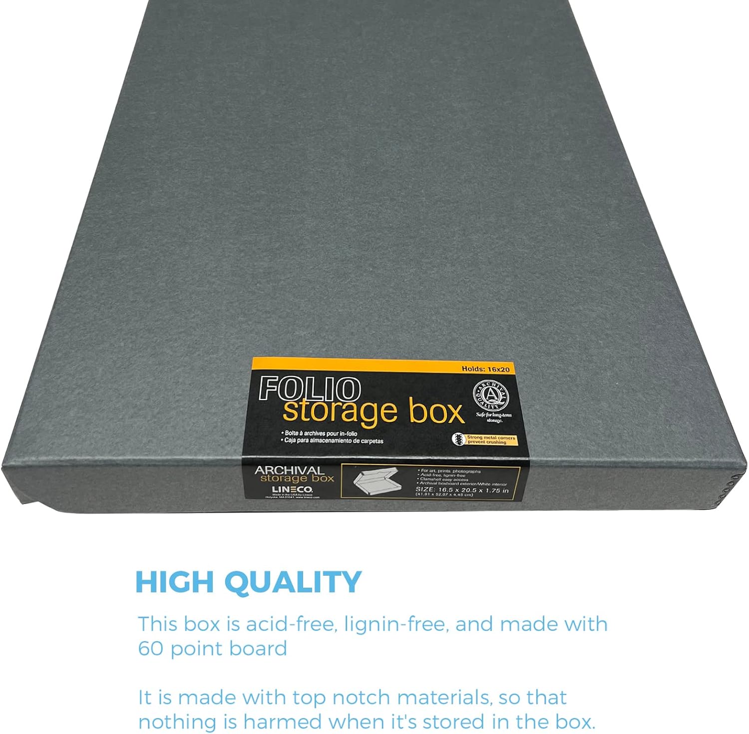 - Acid-free and Lignin-free boxes manufactured in the US from Gray 60pt archival boxboard with metal edge construction for additional strength