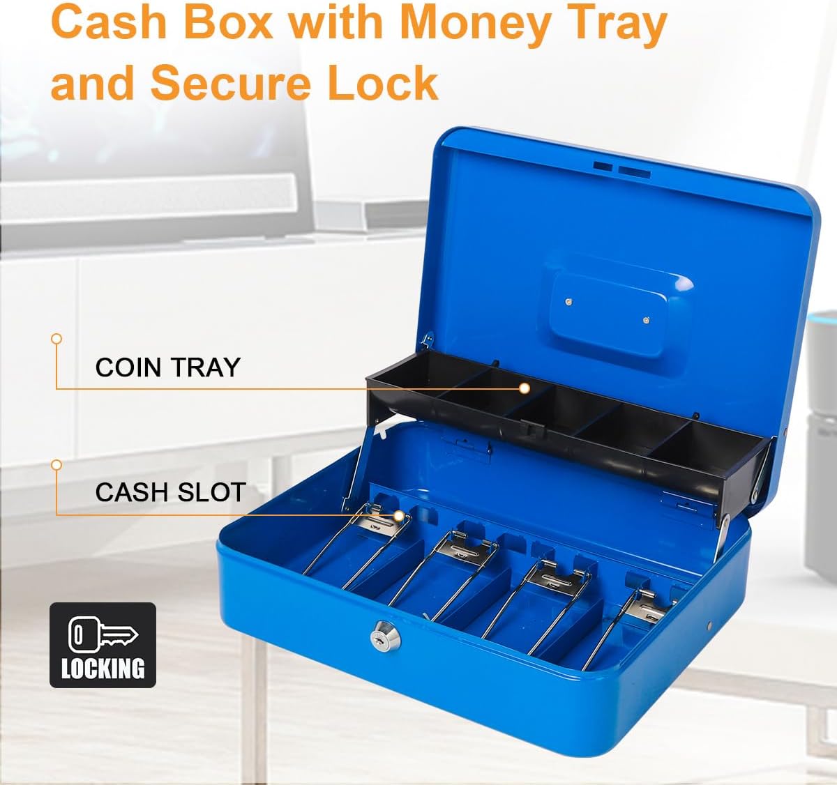 Jssmst Large Locking Cash Box with Money Tray, Lock Box with Security Cable Metal Money Box with Key Lock, Blue