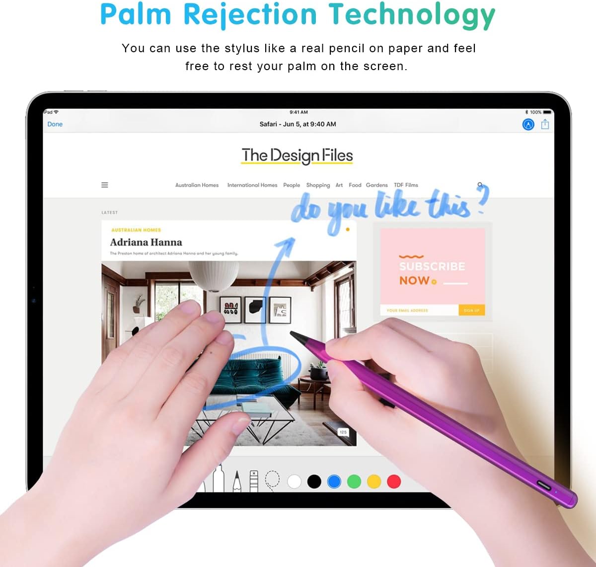 - 【HAND PROTECTIVE & MAGNETIC GRIP】 Palm protection: Carefree writing and drawing, as accidental palm touches are ignored. Magnetic adhesion: Thanks to built-in magnets, the stylus securely adheres to the iPad (no wireless charging possible).