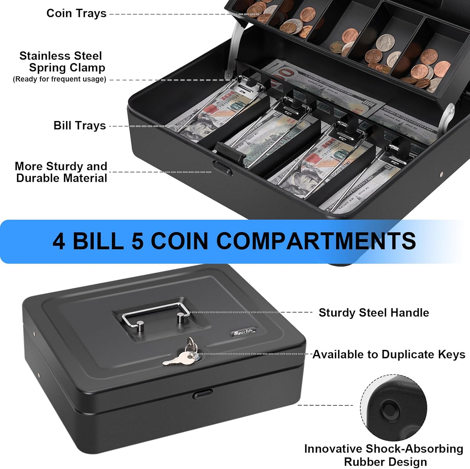 - HUMANIZED DESIGN: Tiered tray design allows for full view of entire working area. when this steel cash box be opened five-compartment cantilever coin tray automatically opens for use . Four spring clips at the bottom of locking cash box can make sure sorting and placement of banknotes.