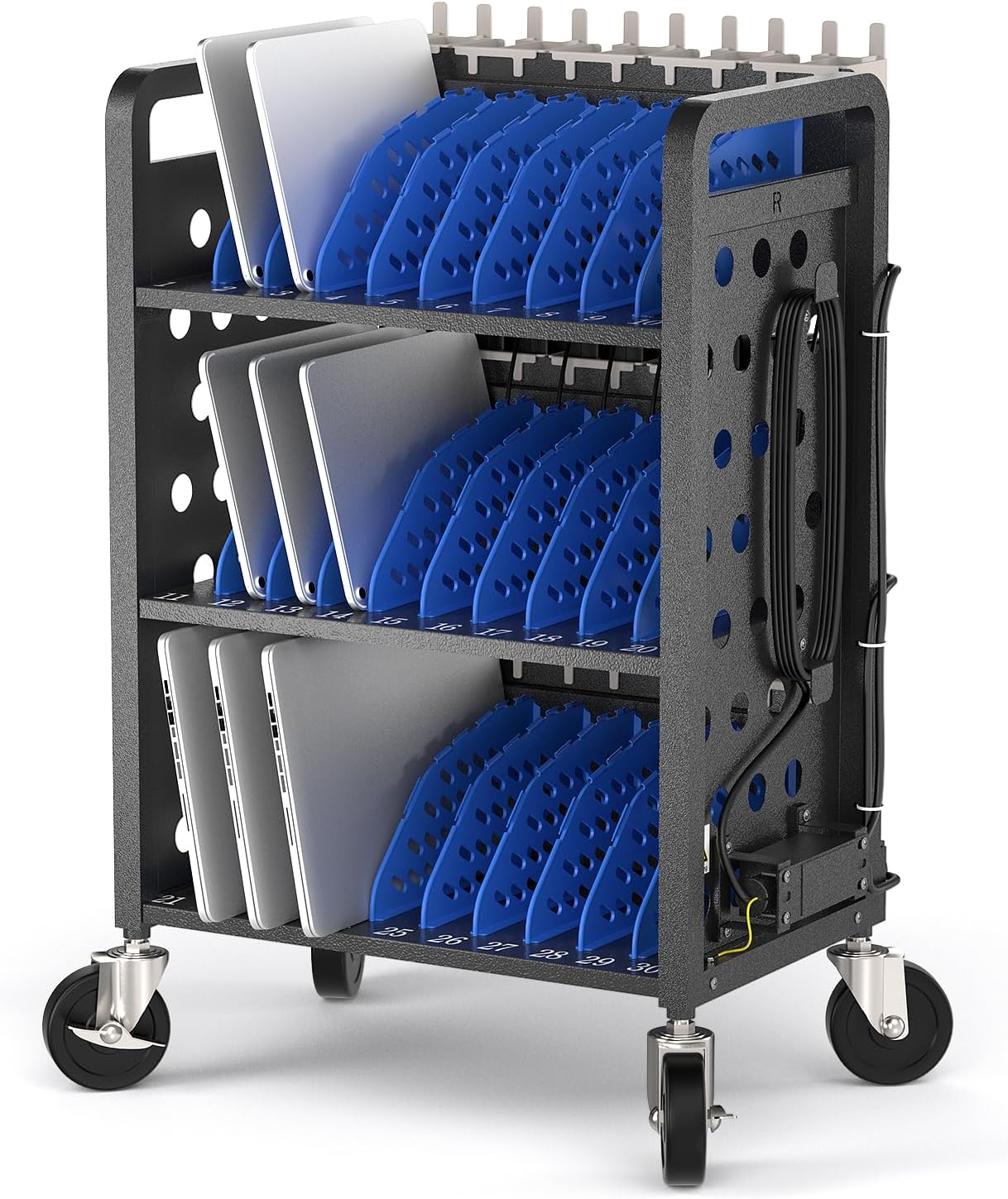 - CABLE MANAGEMENT SYSTEM: No more messy cords! Our laptop charging cart equipped with zig-zag slots on the dividers to tidy up the wires. And come with 30 charger cable organizer for each device, keep the cable organized and neat. The power cord storage wrap on the side can prevent it from getting messy.
