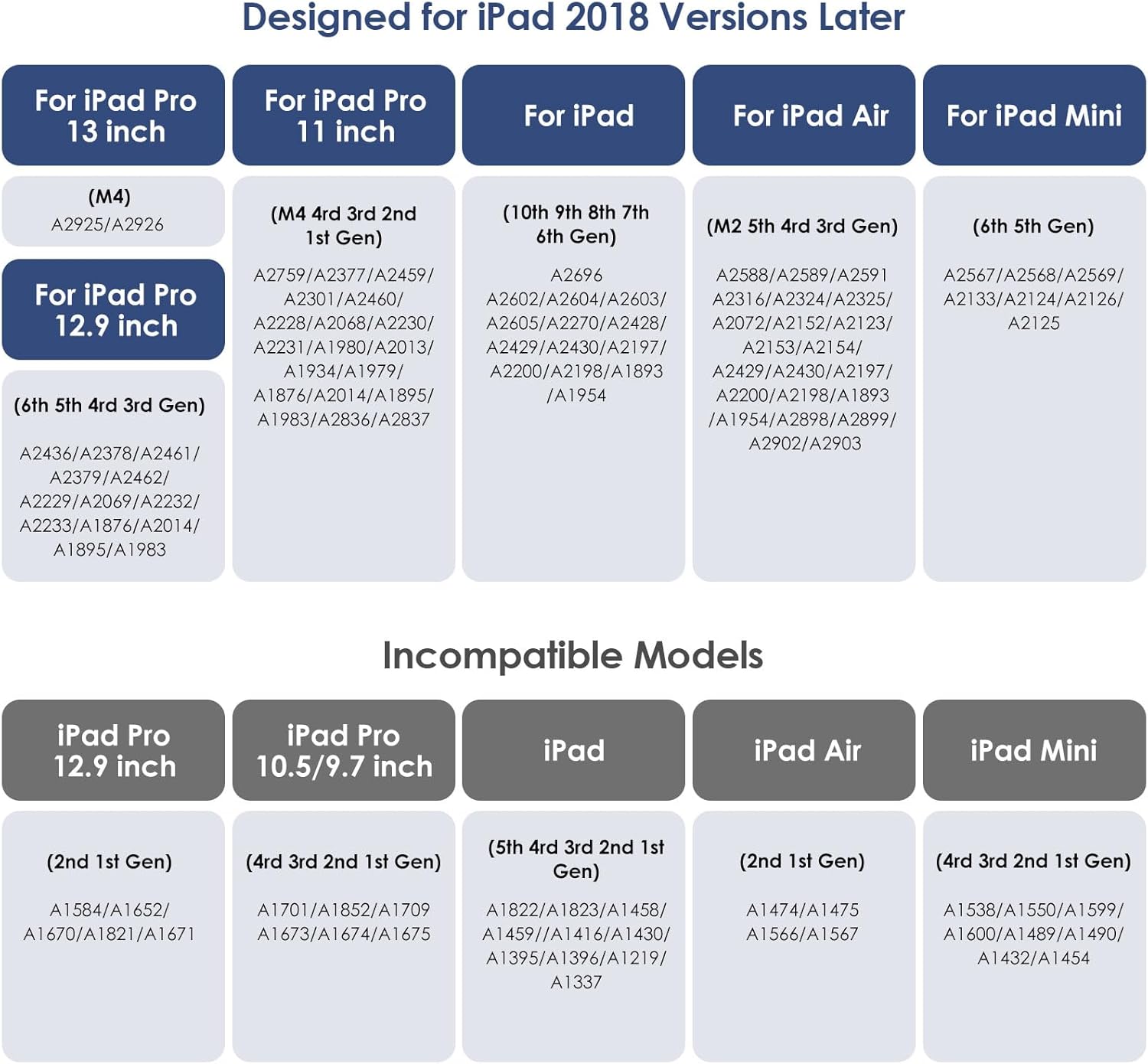- Compatible Devices : iPad (10th/9th/8th/7th/6th Gen): A2696/A2602/A2604/A2603/A2605/A2270/A2428/A2429/A2430/A2197/A2200/A219/A1893/A1954, iPad Air (M2/5th/4th/3rd Gen): A2898/A2899/A2902/A2903/A2588/A2589/A2591/A2316/A2324/A2325/A2072/A2152/A2123/A2153/A2154, iPad Mini (6th/5th Gen): A2133/A2124/A2126/A2125/A2567/A2568/A2569, iPad Pro 11-inch (M4/4th/3rd/2nd/1st Gen): A2836/A2837/A2759/A2377/A2459/A2301/A2460/A2228/A2068/A2230/A2231/A1980/A2013/A1934/A1979, iPad Pro 13-inch (M4): A2925/A2926; iPad Pro 12.9-inch (6th/5th/4th/3rd Gen):A2436/A2378/A2461/A2379/A2462/A2229/A2069/A2232/A2233/A1876/A2014/A1895/A1983 iPad (10th/9th/8th/7th/6th Gen): A2696/A2602/A2604/A2603/A2605/A2270/A2428/A2429/A2430/A2197/A2200/A219/A1893/A1954, iPad Air (M2/5th/4th/3rd Gen): A2898/A2899/A2902/A2903/A2588/A2589/⊠See more
