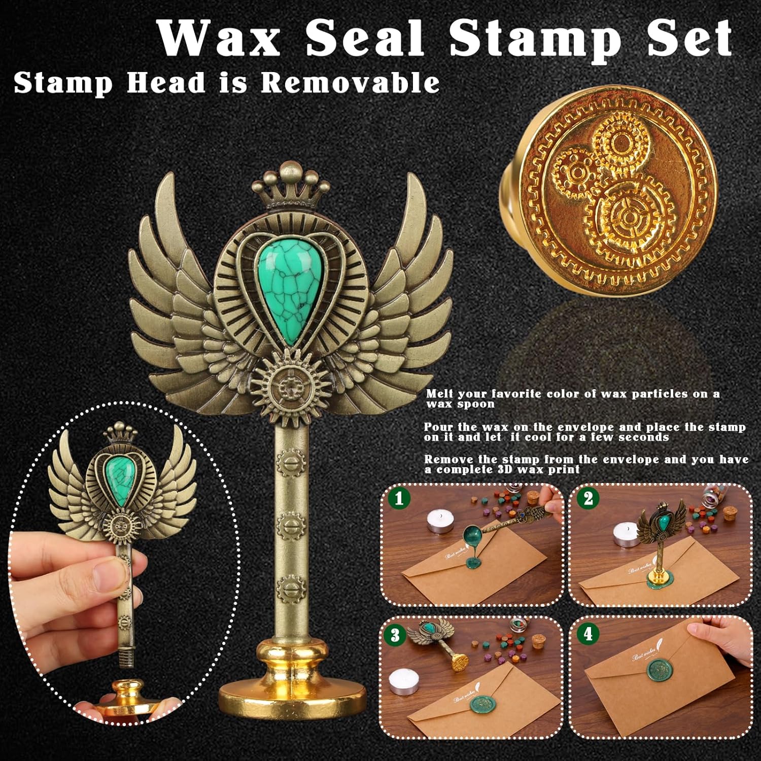 - 【Wax Seal Stamp Kit】: Our wax stamp is made of high quality brass head and metal gear shank, the stamp is printed with a "gear clock" pattern.It creates intricate details and leaves a clean and beautiful imprint.The brass head with stamp is removable and can be used with any stamp pattern.It avoids opening important documents while decorating,embellishing,invitations, envelopes, postcards,gift stamps and other private information