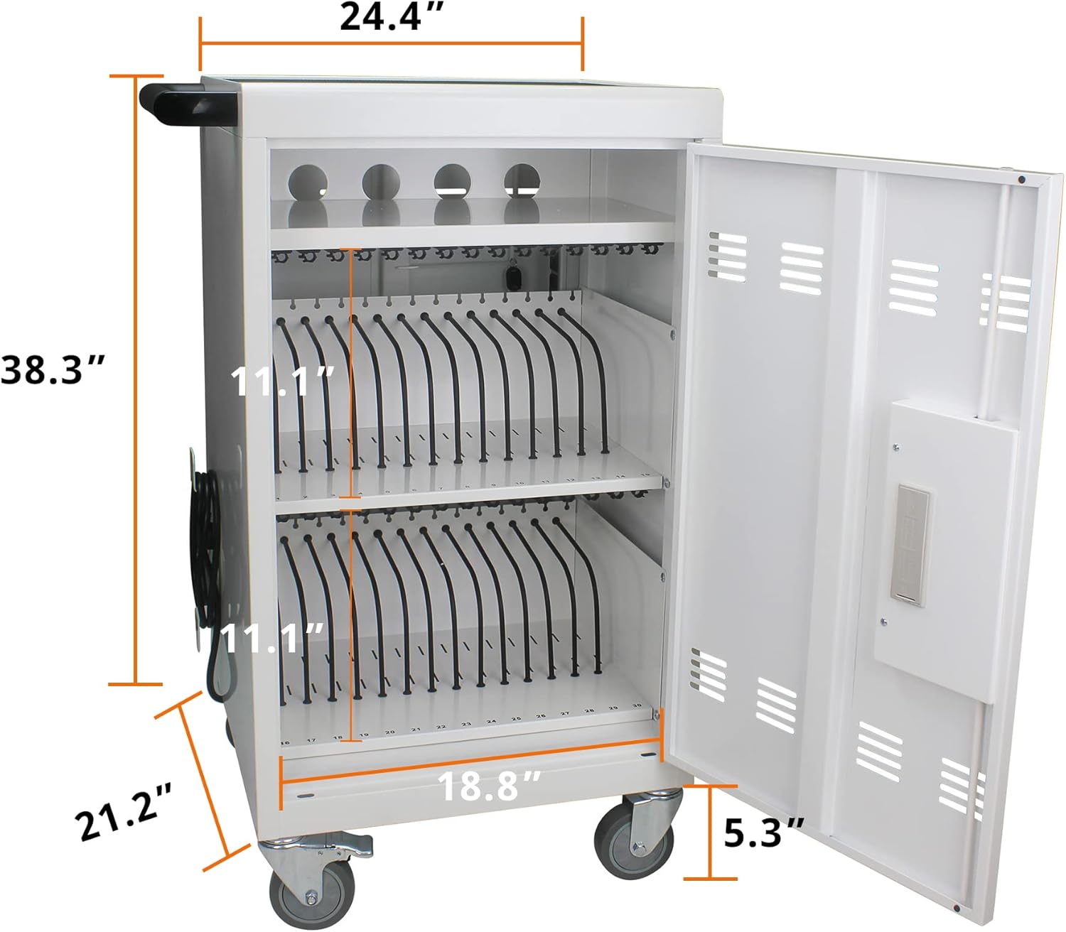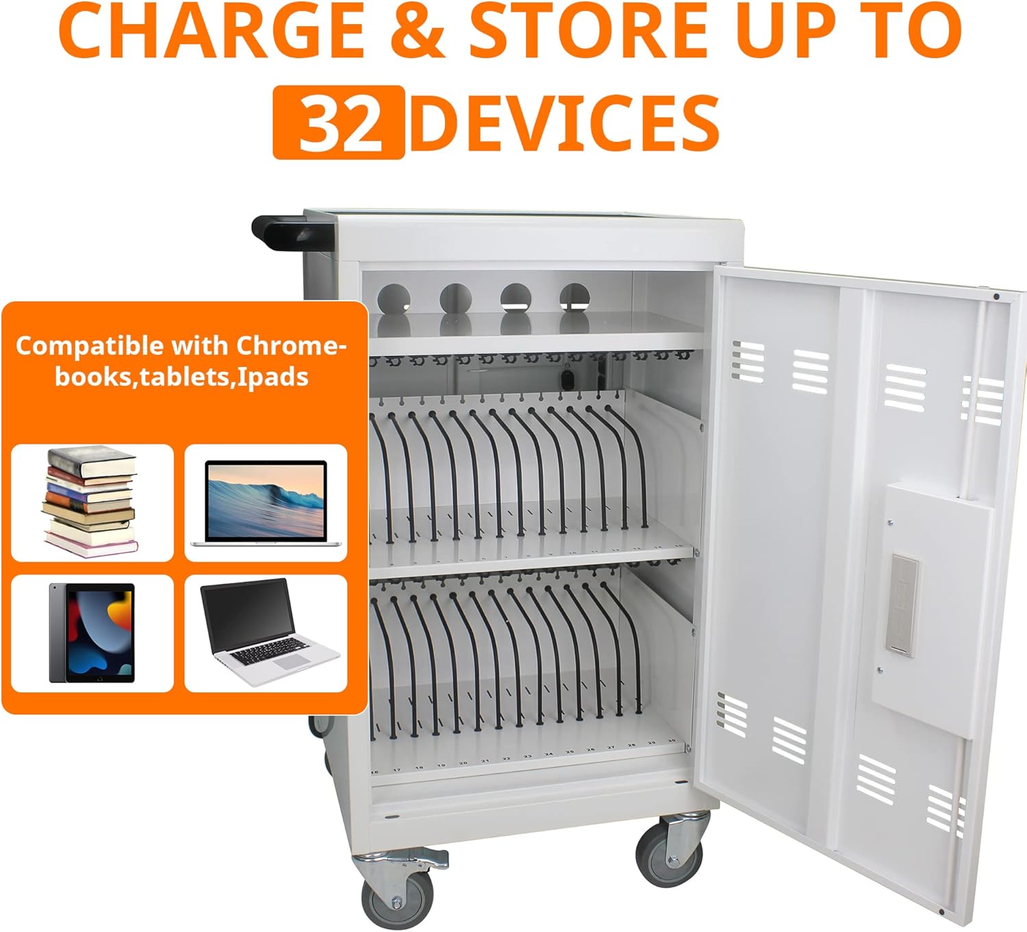 - 【CHARGE & STORE 32 DEVICES】: 30 padded bays, and an extra shelf allow you to store and charge 32 devices at one time, in a secure, space-saving, versatile, mobile cart.(Top shelf for extra charging and storage space)