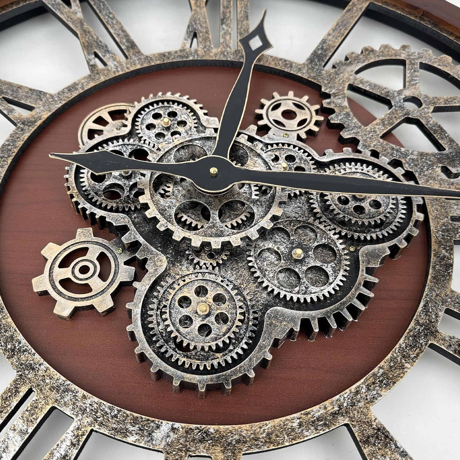 - REAL MOVING GEARS: Large wall clock with unique moving parts is as attractive as it is functional. Put batteries in, various gears start rotating fluently. Moving gear wall clock is amazing looking on the wall and will get so many compliments on it. Made from solid wood and painted by Rust-like color on wall clock create a very rustic and industrial atmosphere. Farmhouse wall clock is professionally handmade and pursuit of naturalness, so it may have some little imperfections