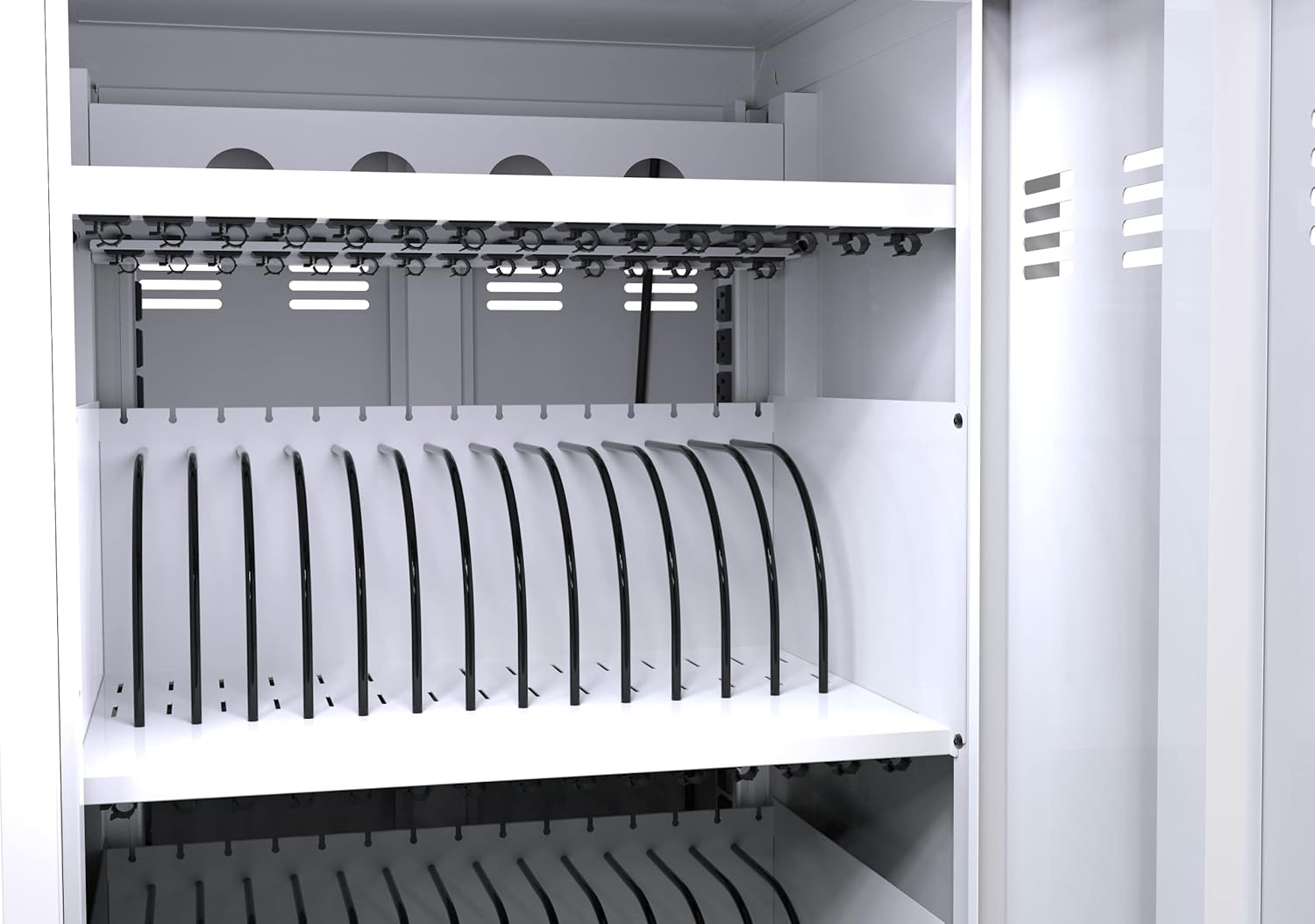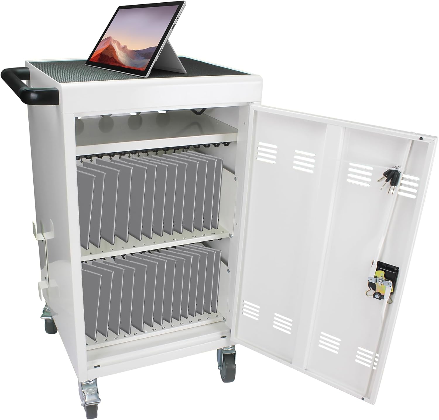 - 【Charge & Store 30 Devices】: Designed to fit up to 30 Chromebooks, versatile enough to support most tablets, laptops/hybrids, and ultrabooks. 30 padded bays and an extra shelf allow you to store and charge more than 30 devices at a time Safe, space-saving, versatile mobile cart. It is an excellent portable charging station.