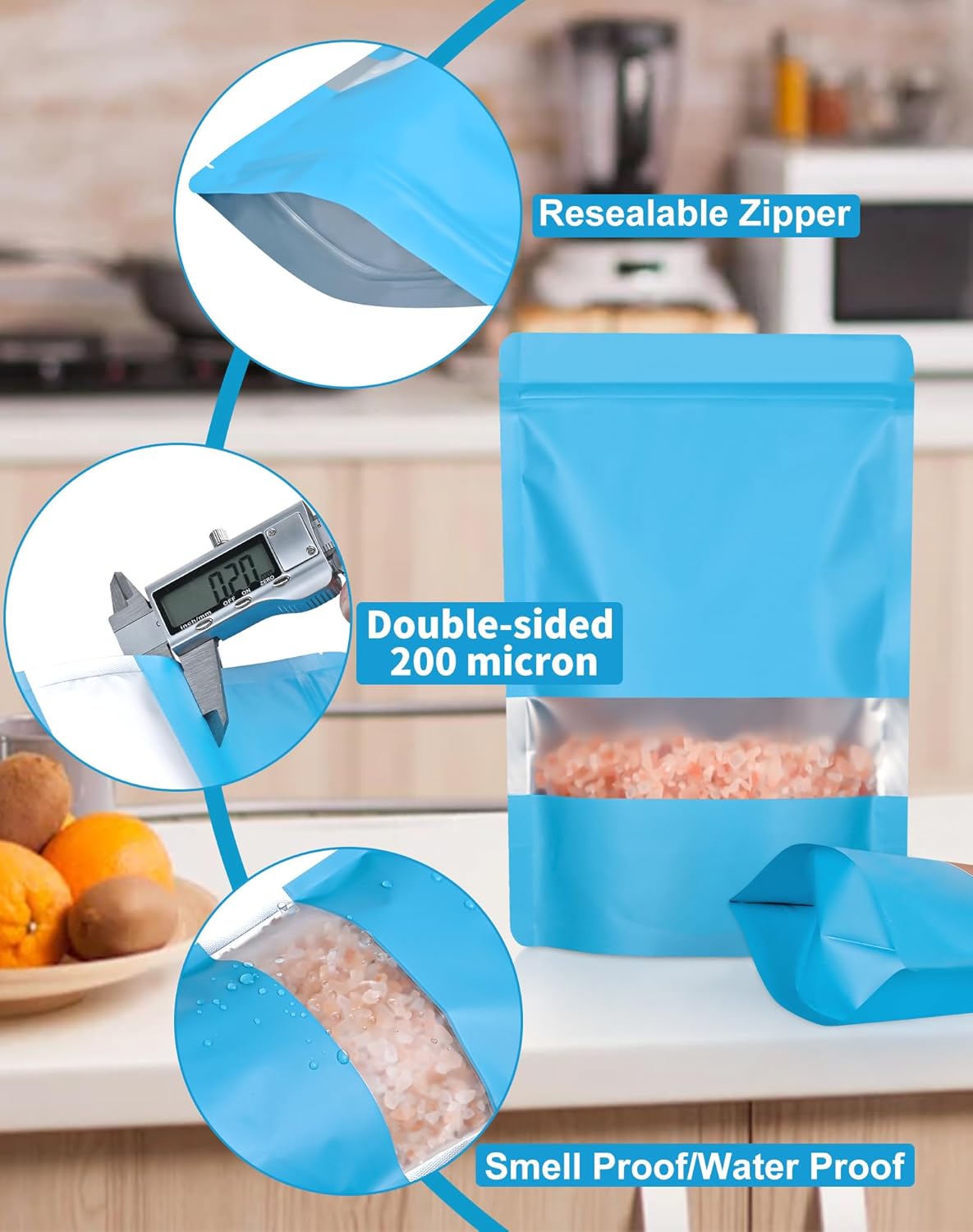 - Resealable Zip lock Bags: With a sealing strip, resealable bags for packaging is easy to close and open. Resealable stand-up pouches can go a long way in helping protect your frequently-needed food from insects, mouse vapors, moisture, odors, and more. resealable bags for food are perfect for spices, bath salts, nuts, oats, cookies, candy, cereal, granola, coffee beans, wax melts, grains, pet treats, spices, seeds, treats, bath bombs wait