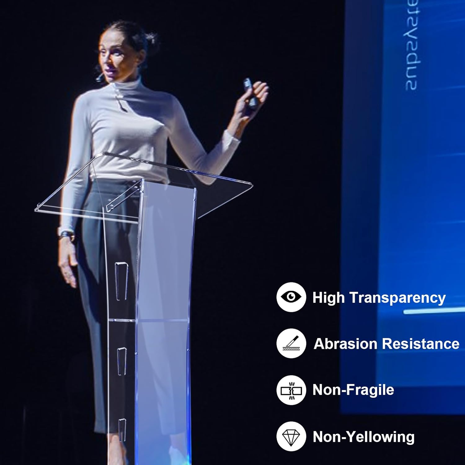 - CRYSTAL CLEAR ACRYLIC - Compared with acrylic lectures on the market, our acrylic podium are made of premium and eco-friendly acrylic material, with a high translucency of 95% by fine polishing, more wear-resistant, drop-resistant, oxidation-proof, and impact-resistant, which brings a more unique visual enjoyment to the speakers and audiences