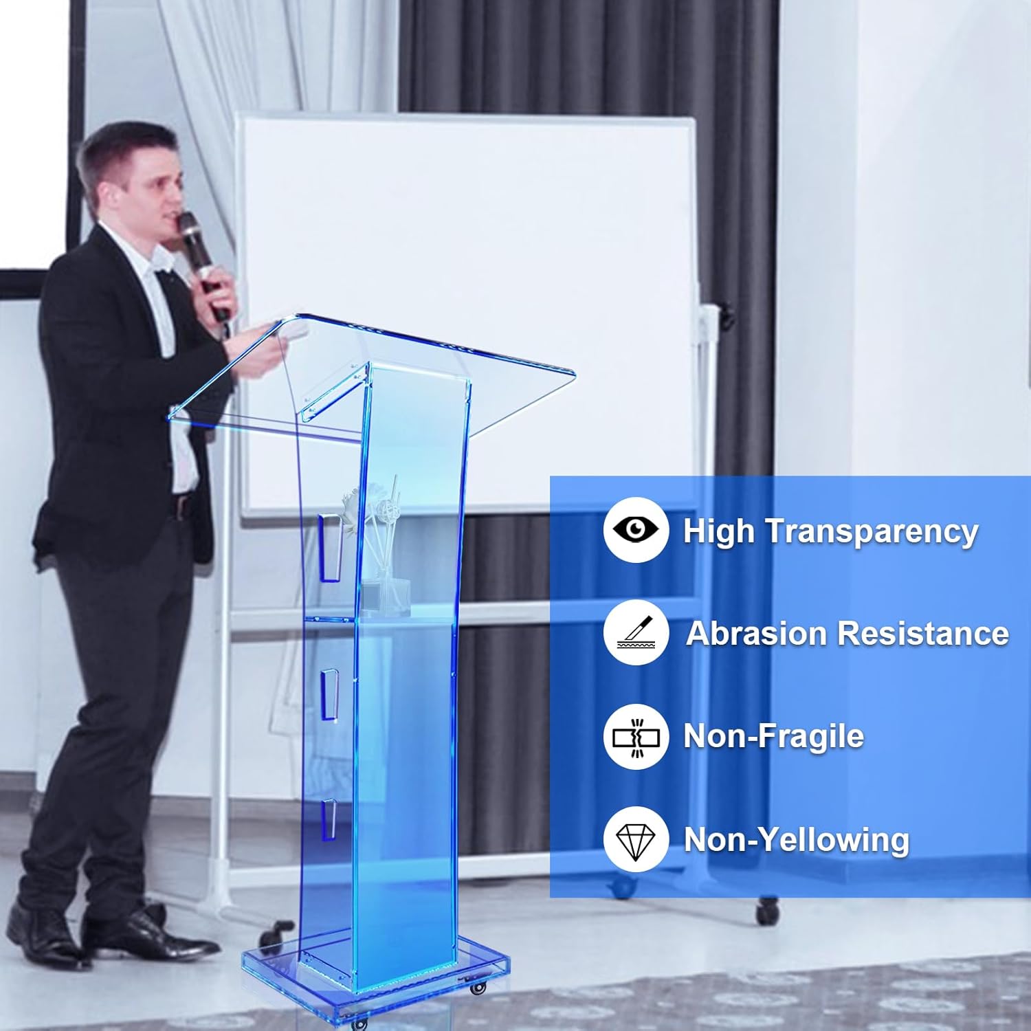 - ELEGANCE LIGHT MODE - The podium is equipped with 15 adjustable lighting modes, which can better meet the needs of modern speeches, hosts, meetings and other activities, and the crystal clear acrylic combined with modern lighting further accentuates the atmosphere of the event