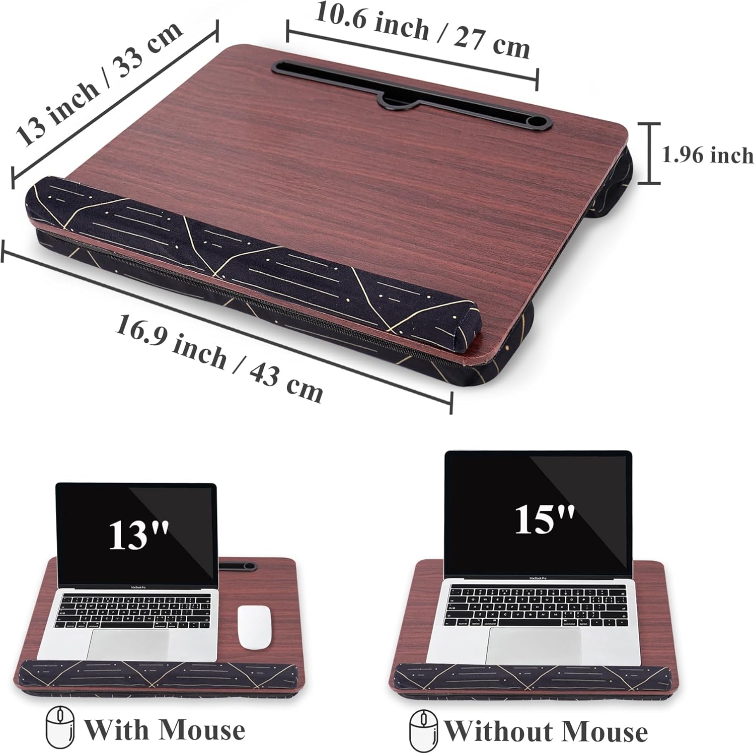 - Perfect Size for Your Laptop: Measuring 17 x 13 x 3 inches, our lap desk can accommodate up to 15.6" laptops (without mouse). It's also suitable for 14" or smaller laptops with enough space for a mouse.