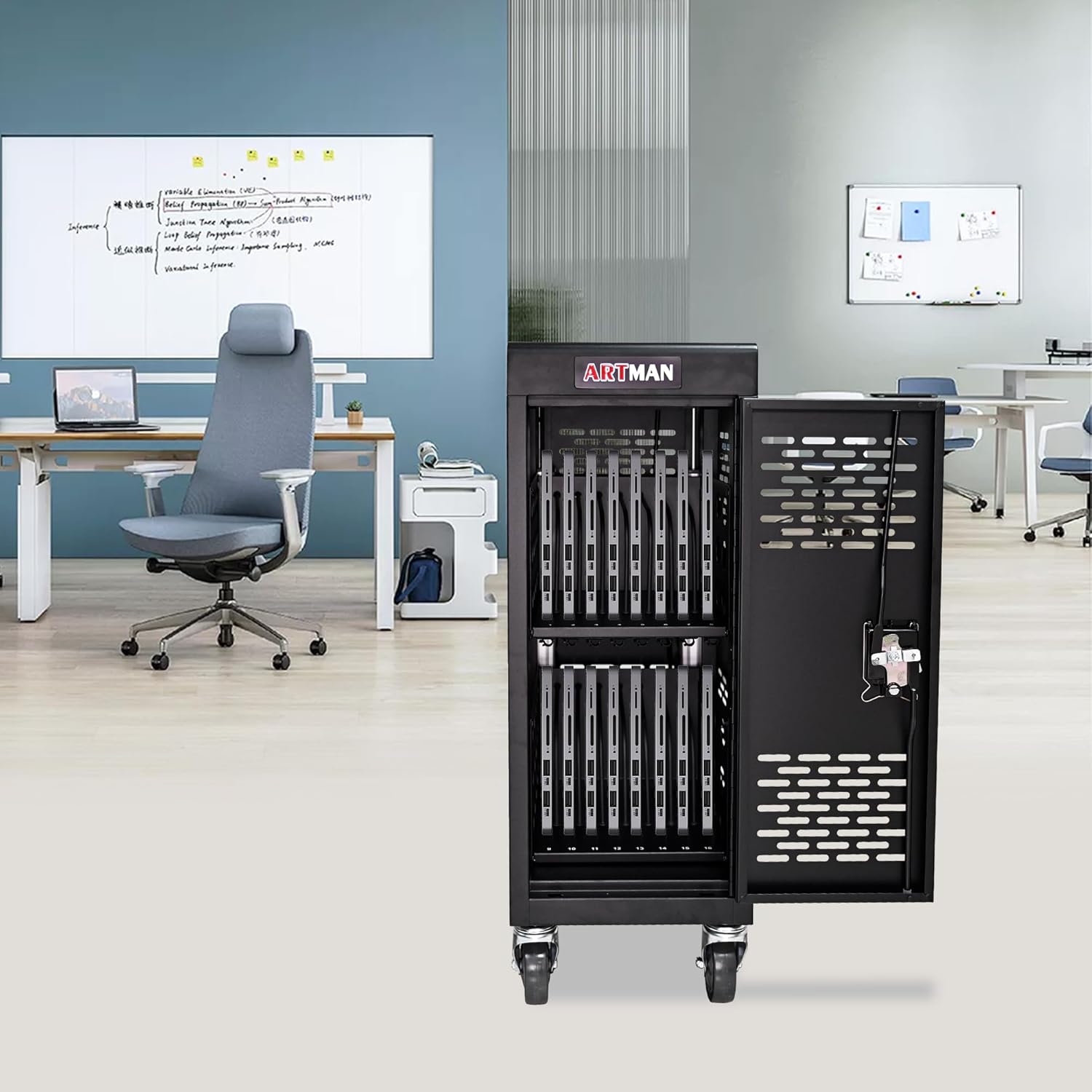 - USER FRIENDLY : Front and back doors open fully for easy access to computers and charging cables. The lockable device cart is ideal for classroom, office, library, hospital, clinics exhibition, coffee shop, airport, training center, etc.