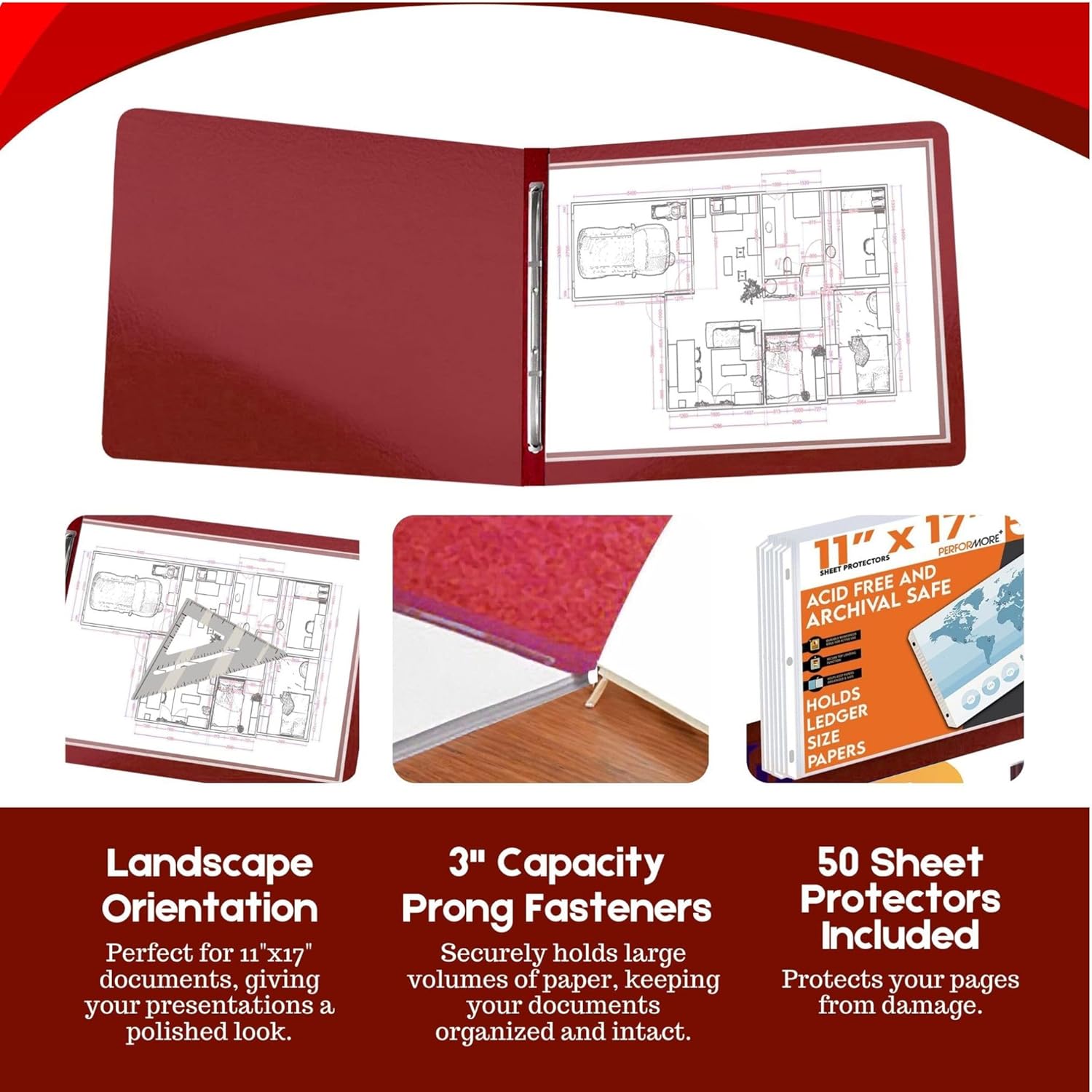 Performore 11x17 Landscape Presentation Binder Folders | Fiberboard Covers | 3-Inch Capacity | 50 Clear Sheet Protectors | Archival-Quality Document Storage | Pack of 10 (Red)