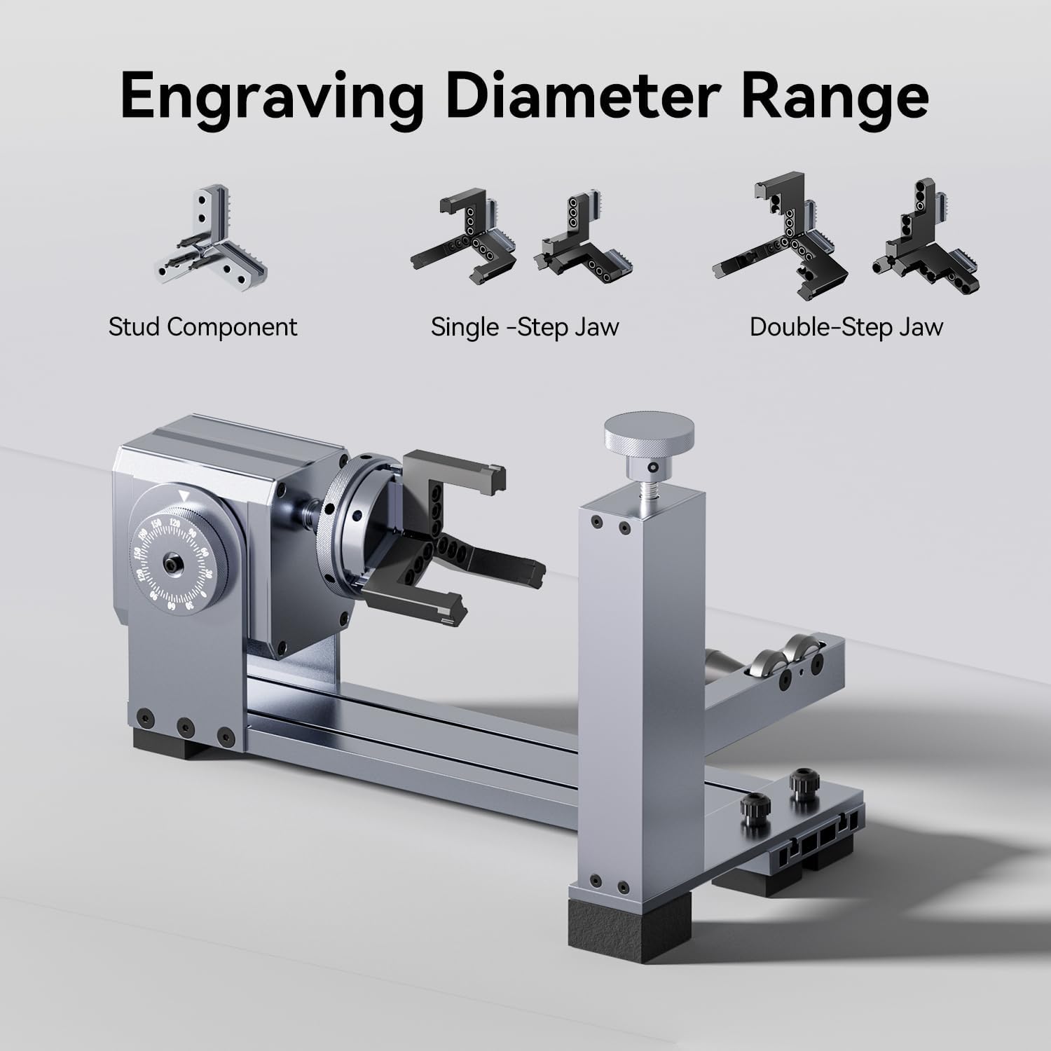 - Higher Speed and Accuracy Engraving; The Longer 4-in-1 laser rotary attachment can hold the object tightly with a soft-pad covering jaws chuck, allowing smooth and efficient operation. The maximum vector engraving speed can reach 360°/s. The laser rotary module packs a precision stepper motor with a minimum angle of 0.45°, getting the best projects without missing a detail