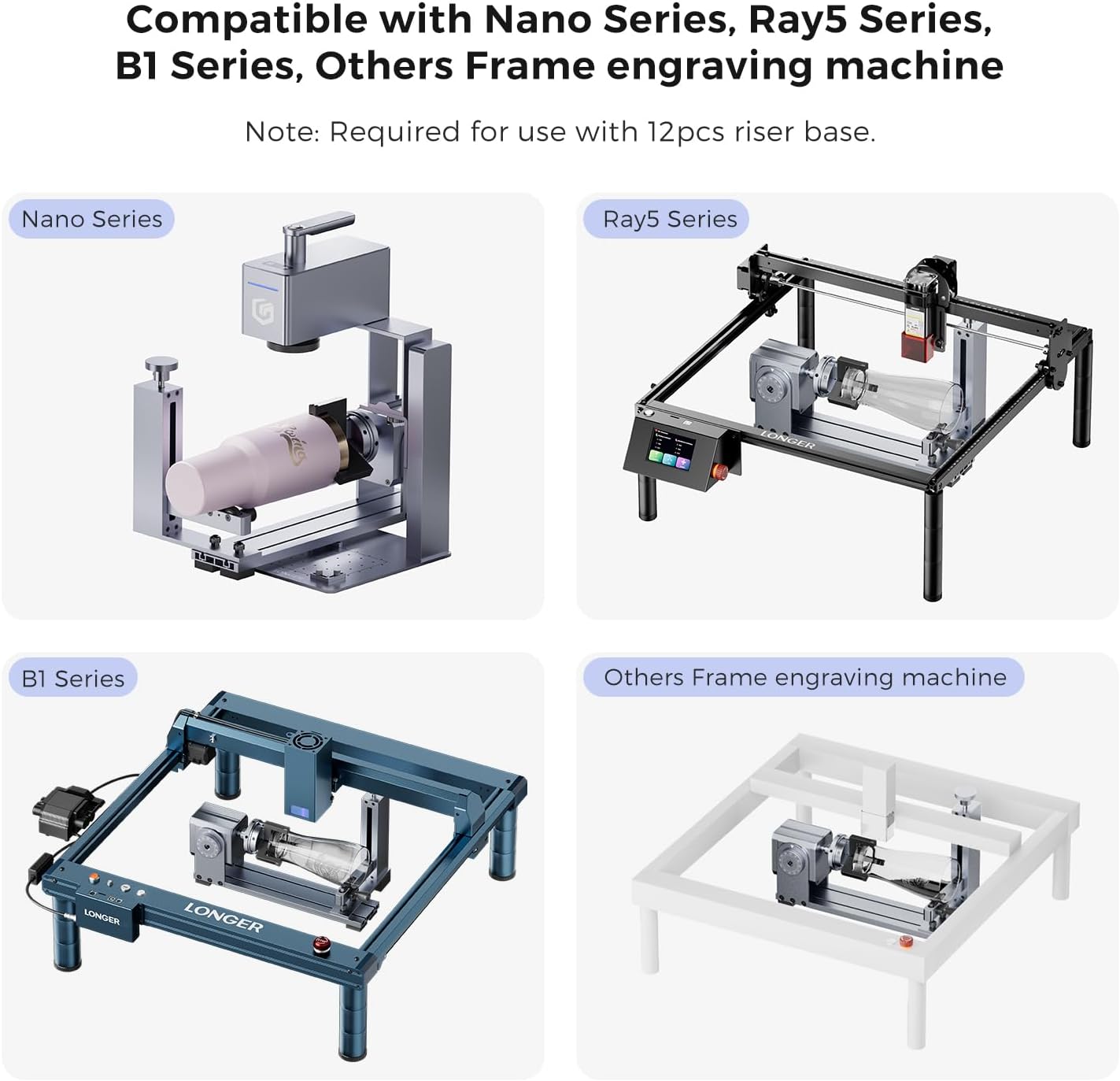 - Wide Compatibility: The Longer 3-in-1 laser rotary attachment is compatible with Nano Series, Ray5 Series, B1 Series, and other frame engraving machines on the market. The Longer 4-in-1 laser rotary attachment is compatible with a wide range of software: Laserbox Basic, LaserGRBL, or LightBurn