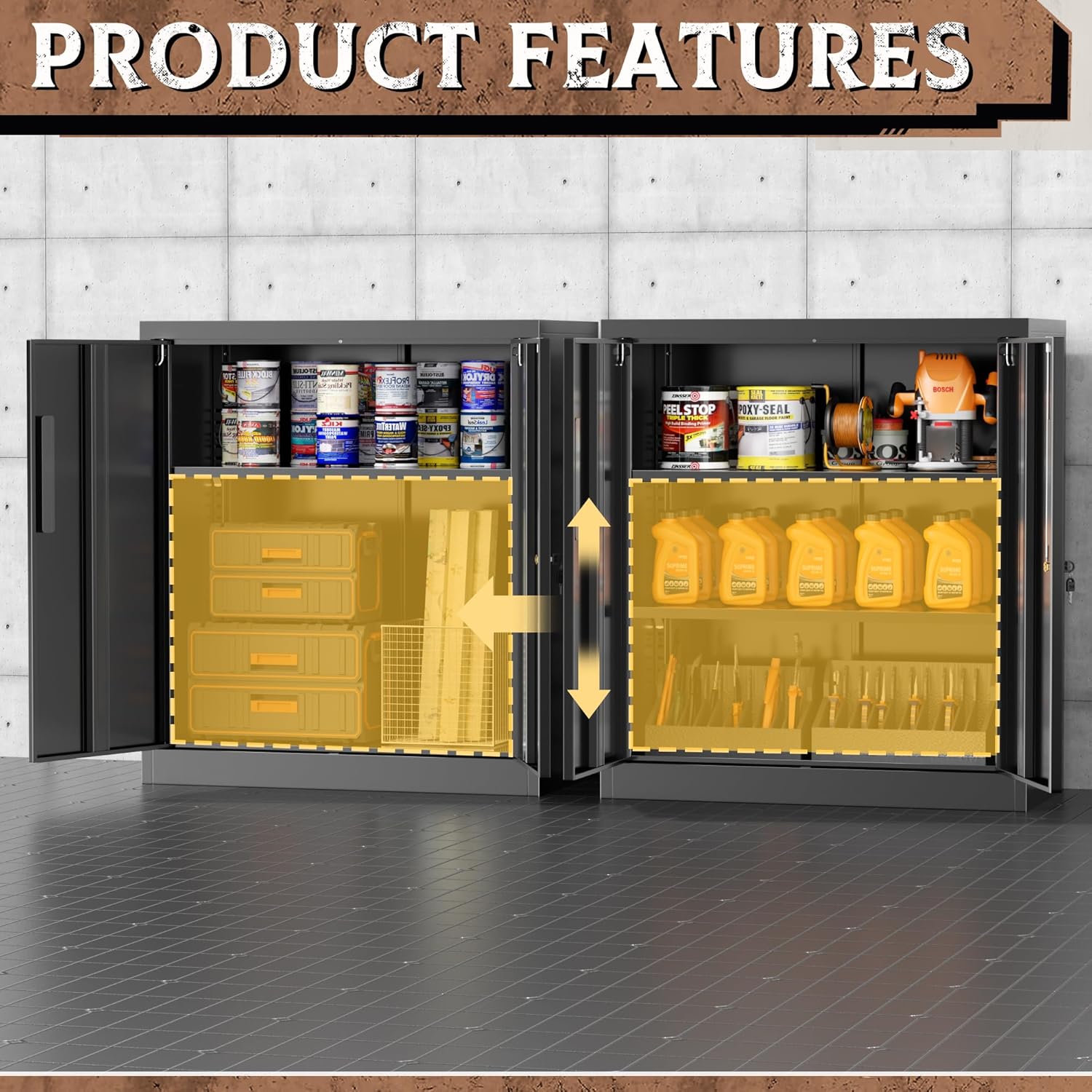 - 【High quality metal materials】Our metal storage cabinet is meticulously crafted with high-quality 0.5mm steel plates. We reinforce each cabinet shelf with additional steel bars to prevent the partitions from deforming and getting dents. It's scratch-resistant, easy to clean and can prolong the service life of the garage cabinet during frequent use.