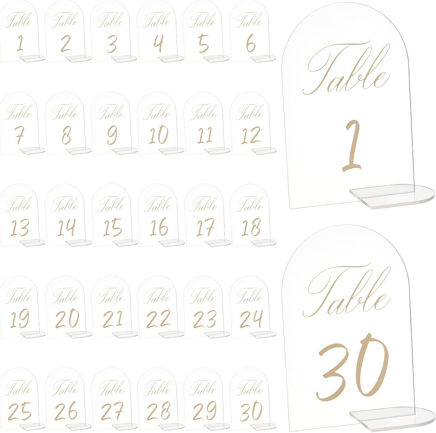 - WHAT YOU WILL GET: You will receive 30 sets of clear arched acrylic wedding table numbers Holders, Includes table numbers 1-30, table signs each with corresponding base, table number size is 4 x 6 inches, base size is 1.57 x 1.18 inches, perfect for weddings, event parties, restaurants.