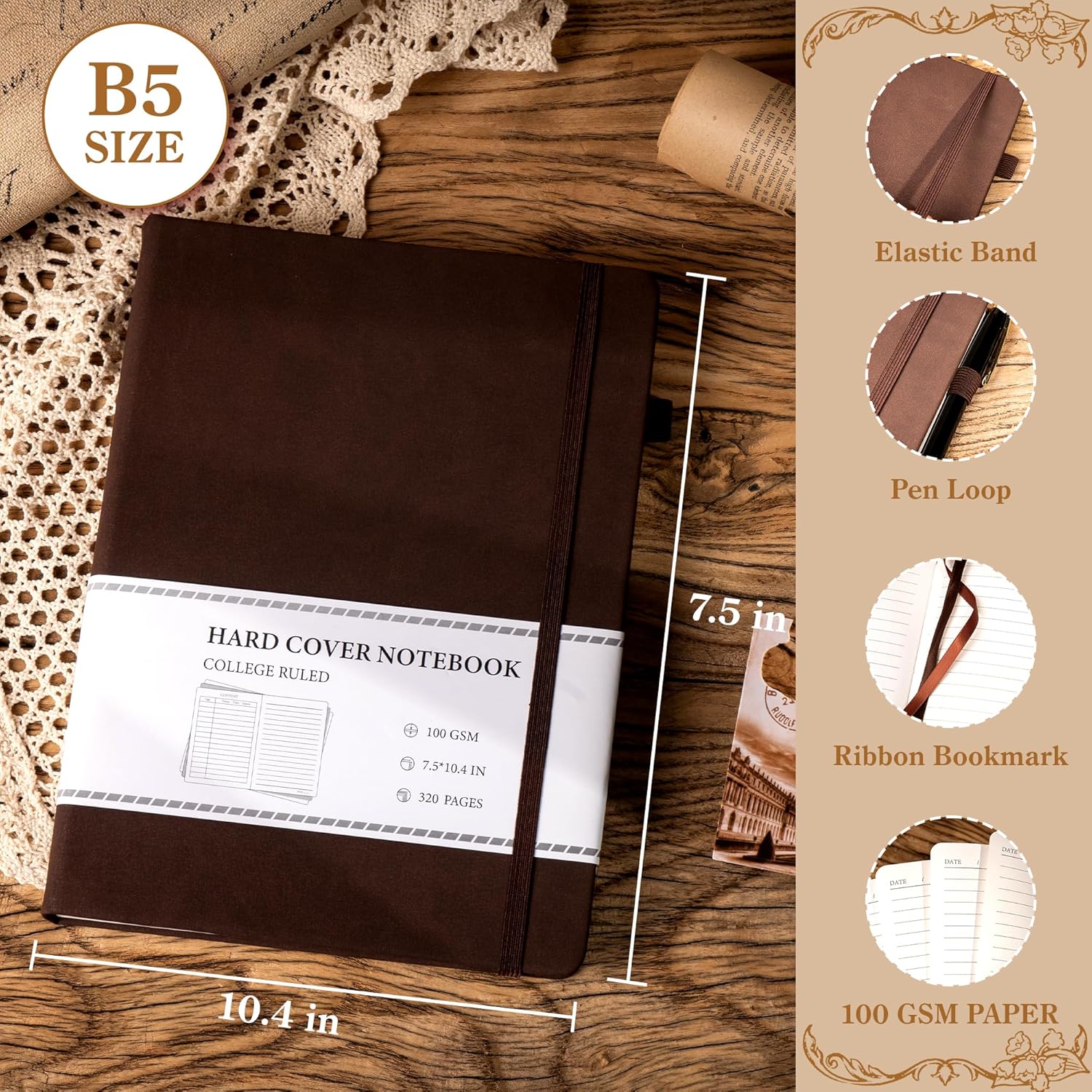 CAGIE B5 Journal Notebook for Men Women 320 Pages 100 Gsm Paper Vintage Journaling Notebooks A5 Hardcover Leather Journals for Writing Travel Work Note Taking Diary, 7.6x10 In, Dark Brown
