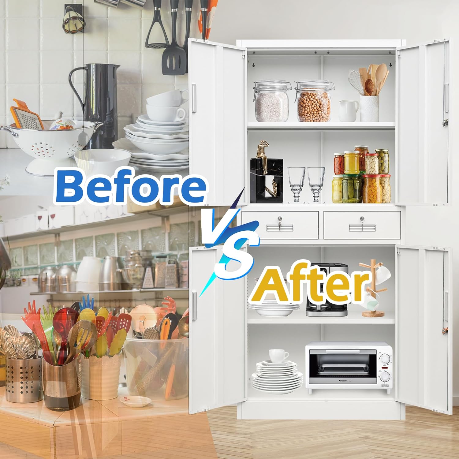 CMY Metal Storage Cabinet, 71" H x 32" W x 16" D Locking Cabinet with Adjustable Shelves and 2 Drawers, Steel Storage Cabinet for Office, Garage, Home, School, Utility Room-White