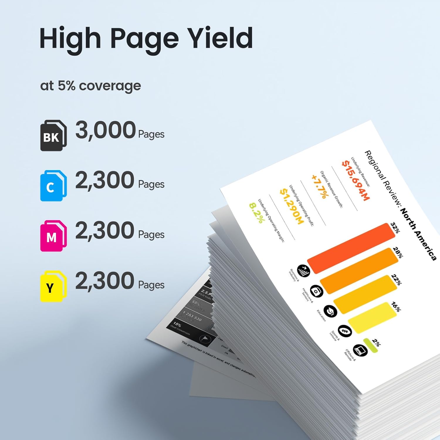 - High Page Yield: Black ink is 3000 pages & color is 2300 pages per cartridge at 5% coverage on letter/a4
