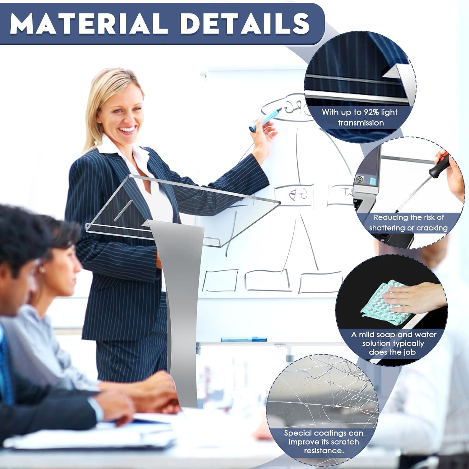 - 【Ergonomic Height】The podium measures 42.5‘’(H)*26.7''(W)*15.7''(L), making this design perfect for a classroom or church. The podium is made of high quality acrylic material with a thickness of 10mm, which is not only sturdy and durable, but also has a high degree of transparency and will not be damaged by long time use.