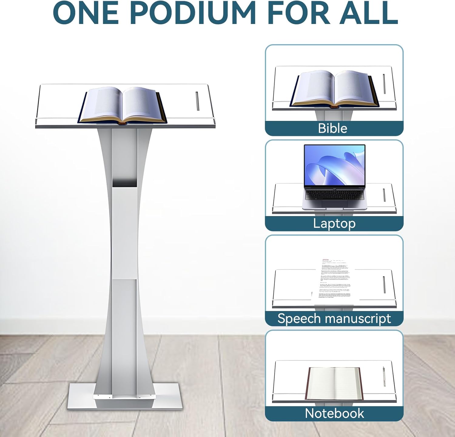 - 【Ergonomic Height】The podium measures 42.5‘’(H)*26.7''(W)*15.7''(L), making this design perfect for a classroom or church. The podium is made of high quality acrylic material with a thickness of 10mm, which is not only sturdy and durable, but also has a high degree of transparency and will not be damaged by long time use.