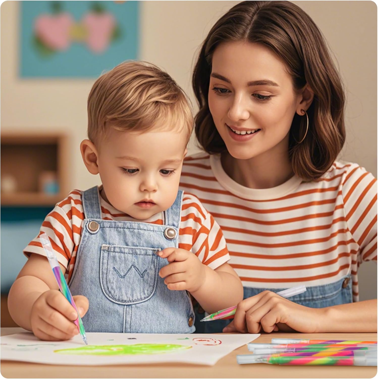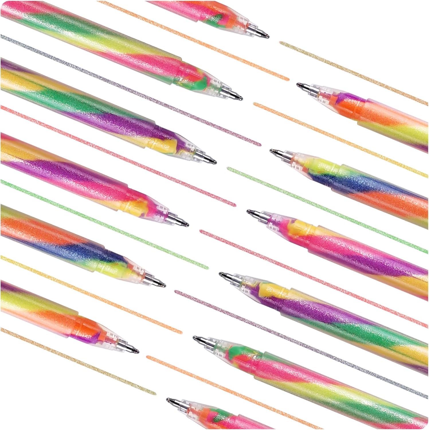 - 【Magical 3-Color Mixing with Stable Chroma】12 pcs rainbow gel pens, including 12pcs glitter with 6 color combination. Each pen contains triple-color ink blends for dynamic transitions with every stroke. New! Enhanced color stability prevents uneven fading or streaking, ensuring vivid rainbow effects on both light & dark papers.
