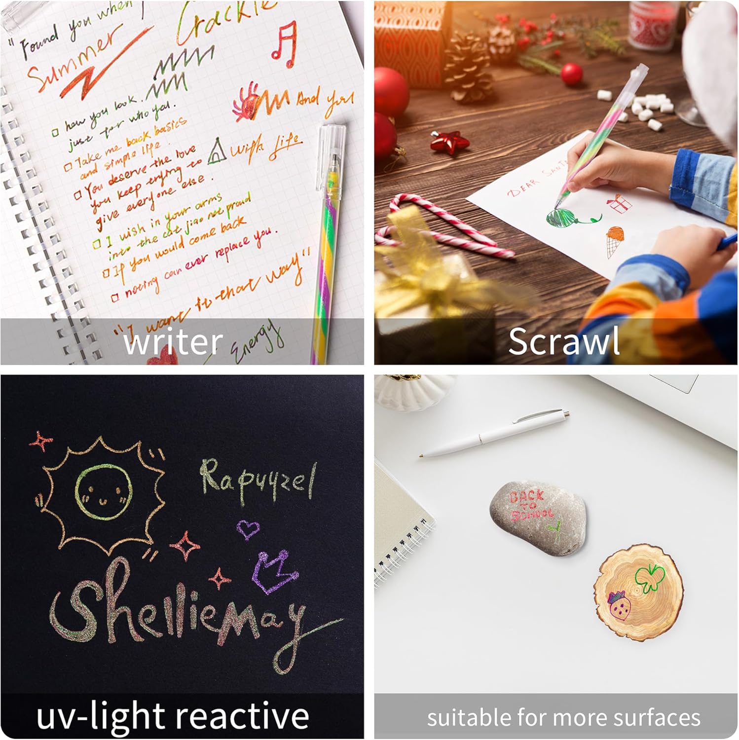 - 【Fun To Use】Each gel pen writing effect is a gradient of color, even on thin journal pages. Smooth-flow ink glides effortlessly on all paper, cloth, wood, stone surfaces – from coloring books to black scrapbook pages where pastel shades pop vividly.
