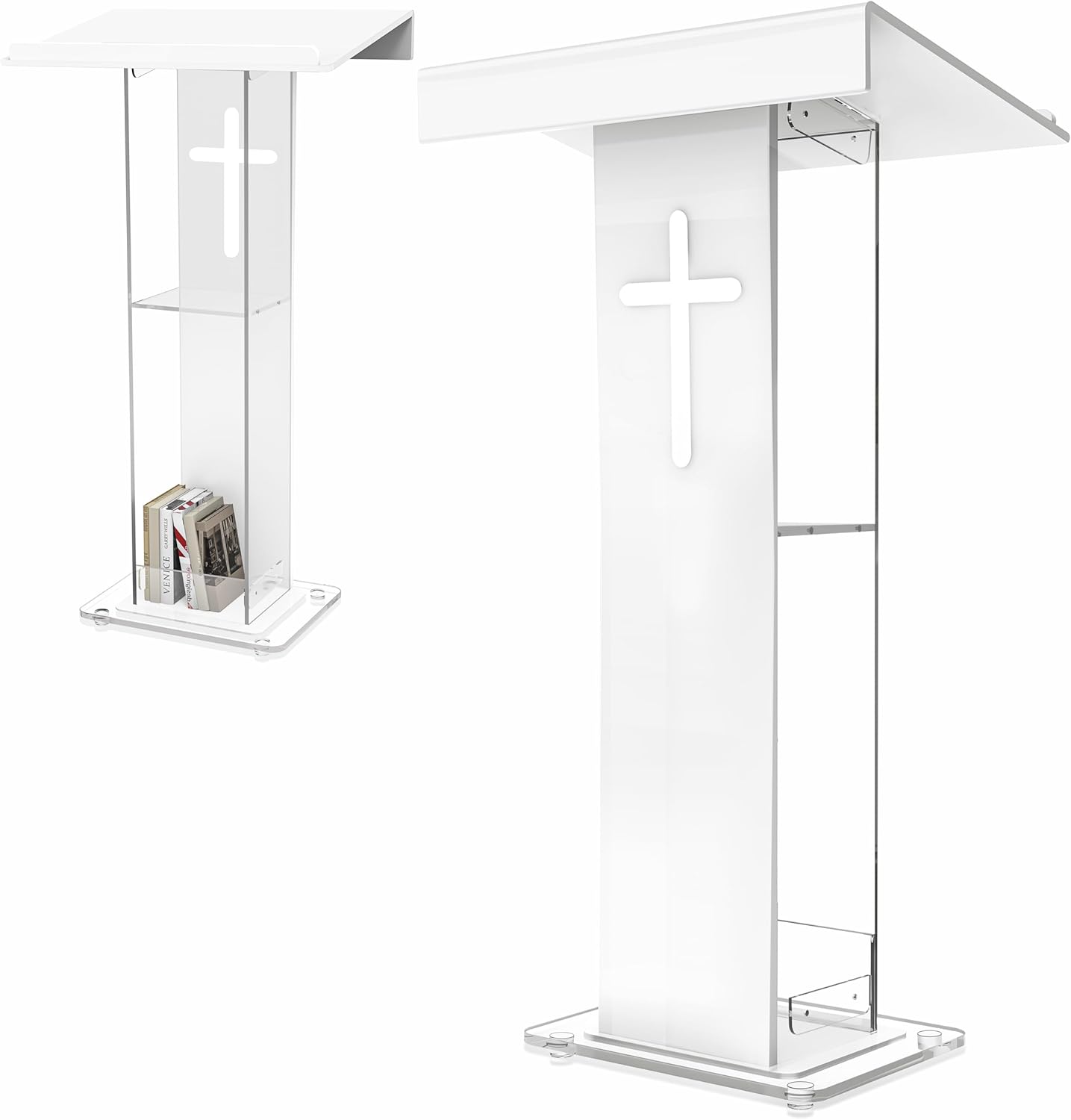 45.3 Acrylic Podium Lectern, Pulpit for Churches Stand with Double Shelves, Modern Plexiglass Pulpits Lectern with Cross Design for Classroom, Conference, Presentation,Wedding