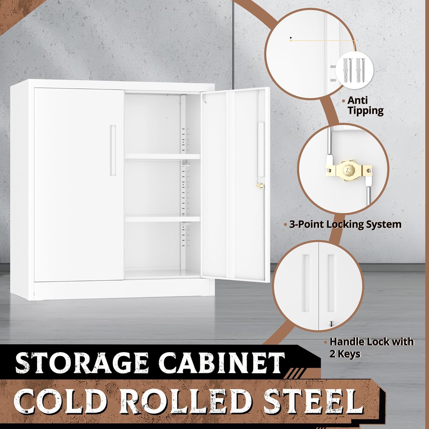 - 【Upgrade design】The metal storage cabinet features 2 adjustable shelves to accommodate items of various sizes. Each shelf can bear a weight of 180 pounds. There are reserved holes at the back of the cabinet for wall installation, and it has an anti-tipping design.