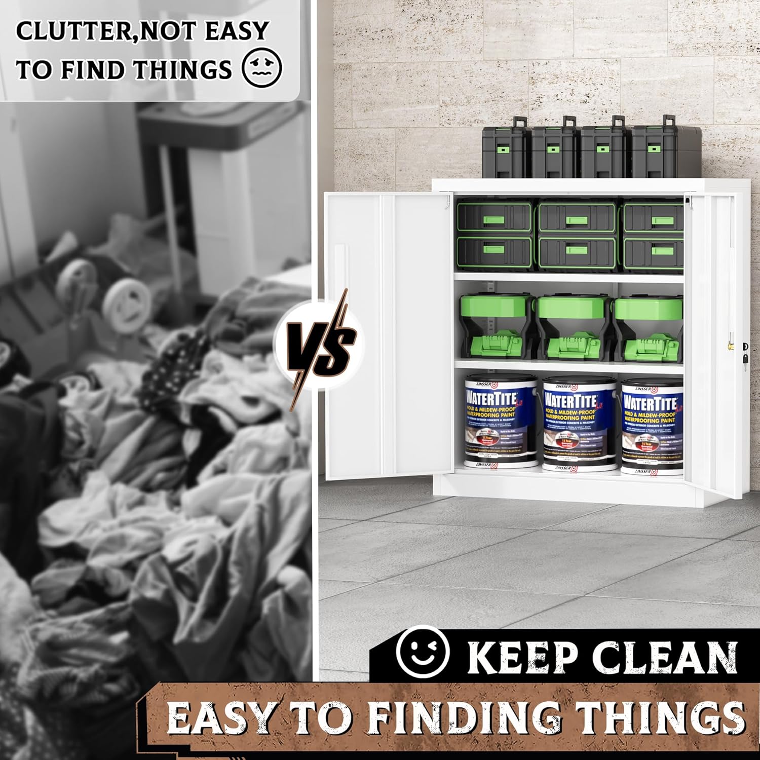 - 【High quality metal materials】Our metal storage cabinet is meticulously crafted with high-quality 0.5mm steel plates. We reinforce each cabinet shelf with additional steel bars to prevent the partitions from deforming and getting dents. It's scratch-resistant, easy to clean and can prolong the service life of the garage cabinet during frequent use.