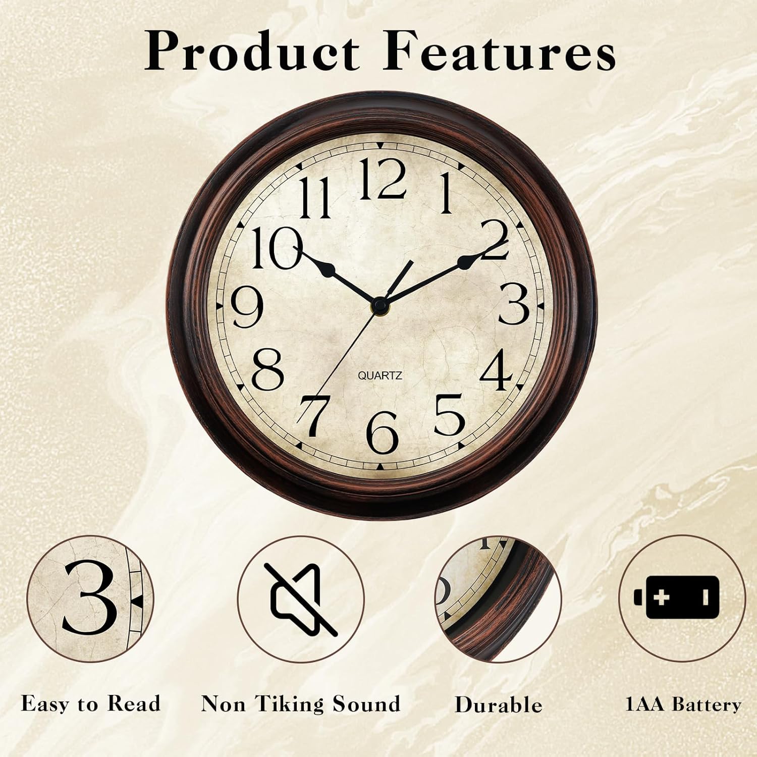12 Inch Wall Clocks Battery Operated Silent Non-Ticking Analog Wall Clock Vintage Retro Rustic Style Decorative for Living Room Kitchen Home Office(Bronze)