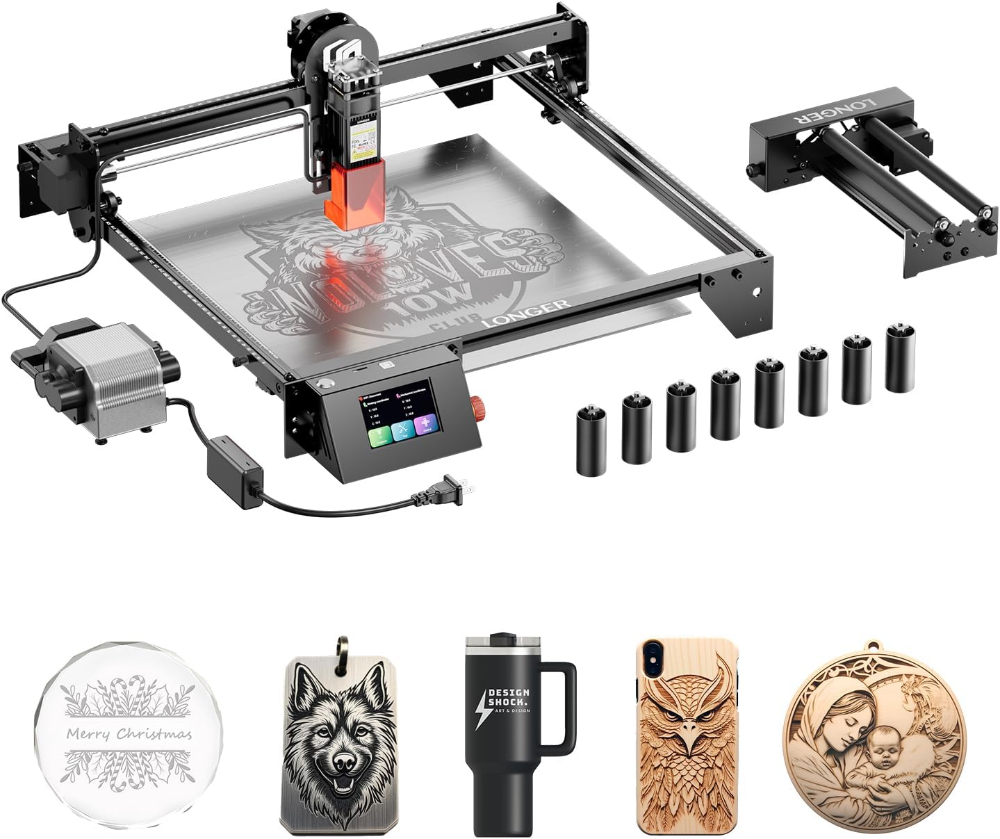 Longer RAY5 10000mW Laser Engraver with Air Assist Kit, Rotary Roller, and 8 Pcs Raiser, Compressed Spot CNC, App Offline Control, DIY Engraving Tool for Metal/Glass/Wood, Class 4.