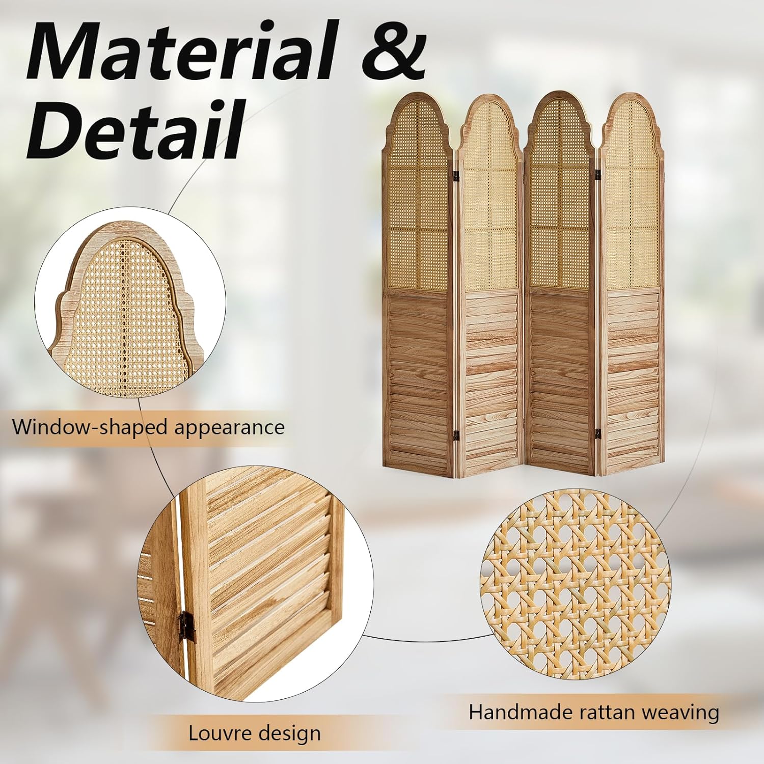 - Window Shape Design & Rattan Craftsmanship: The upper part of the rattan room divider is designed in the shape of a classic european window, with exquisite rattan craftsmanship, showing an elegant artistic flavor. Rattan not only gives the room divider a unique texture and feel, but also enhances the overall air permeability and lightness, which is suitable for creating a cozy and natural home atmosphere, making it the highlight of home decoration.