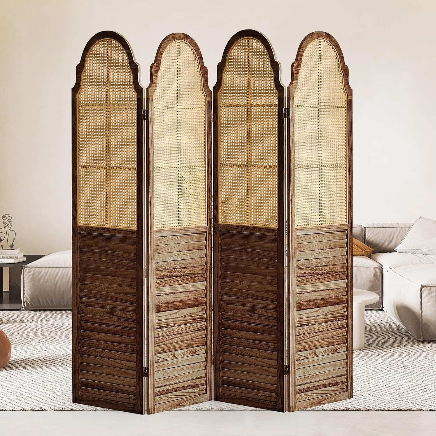 4 Panel Rattan Room Divider Panel, 5.6Ft Partitions and Dividers, Louvered Partition Divider, Room Dividers Screen, Solid Wood Frame, Folding Screen, Bedroom, Family Room, Dark Brown