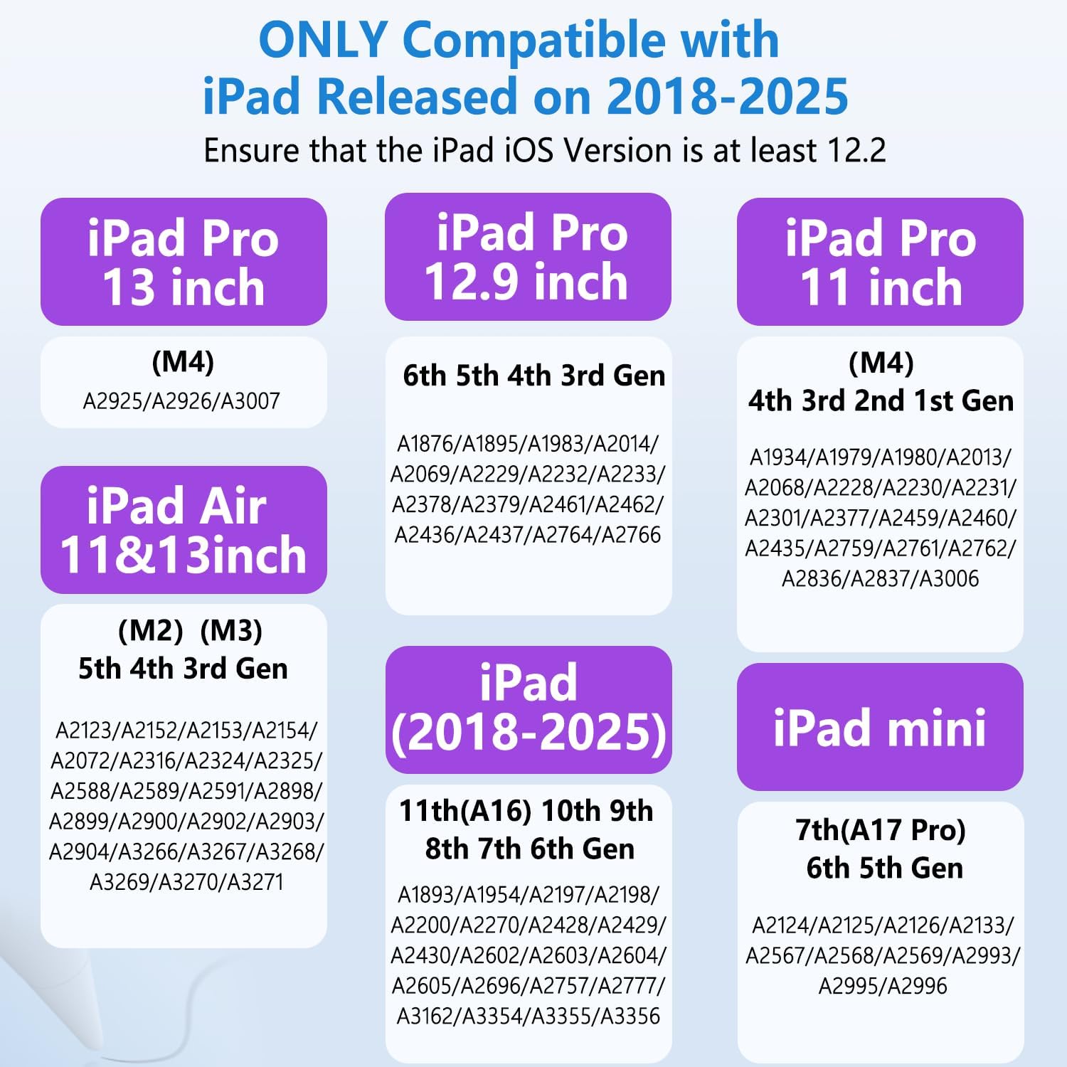 - ăCompatible with 2018-2025 Apple iPadăThe iPad Pen is ONLY compatible with following iPad model number. iPad Pro 13inch (M4), iPad Pro 12.9inch(3rd/4th/5th/6th), iPad Pro 11inch(All Generations), iPad Air M3/M2/5th/4th/3rd Gen, iPad 11th(A16)/10th/9th/8th/7th/6th, iPad Mini 7thïŒA17 ProïŒ/6th/5th Gen.