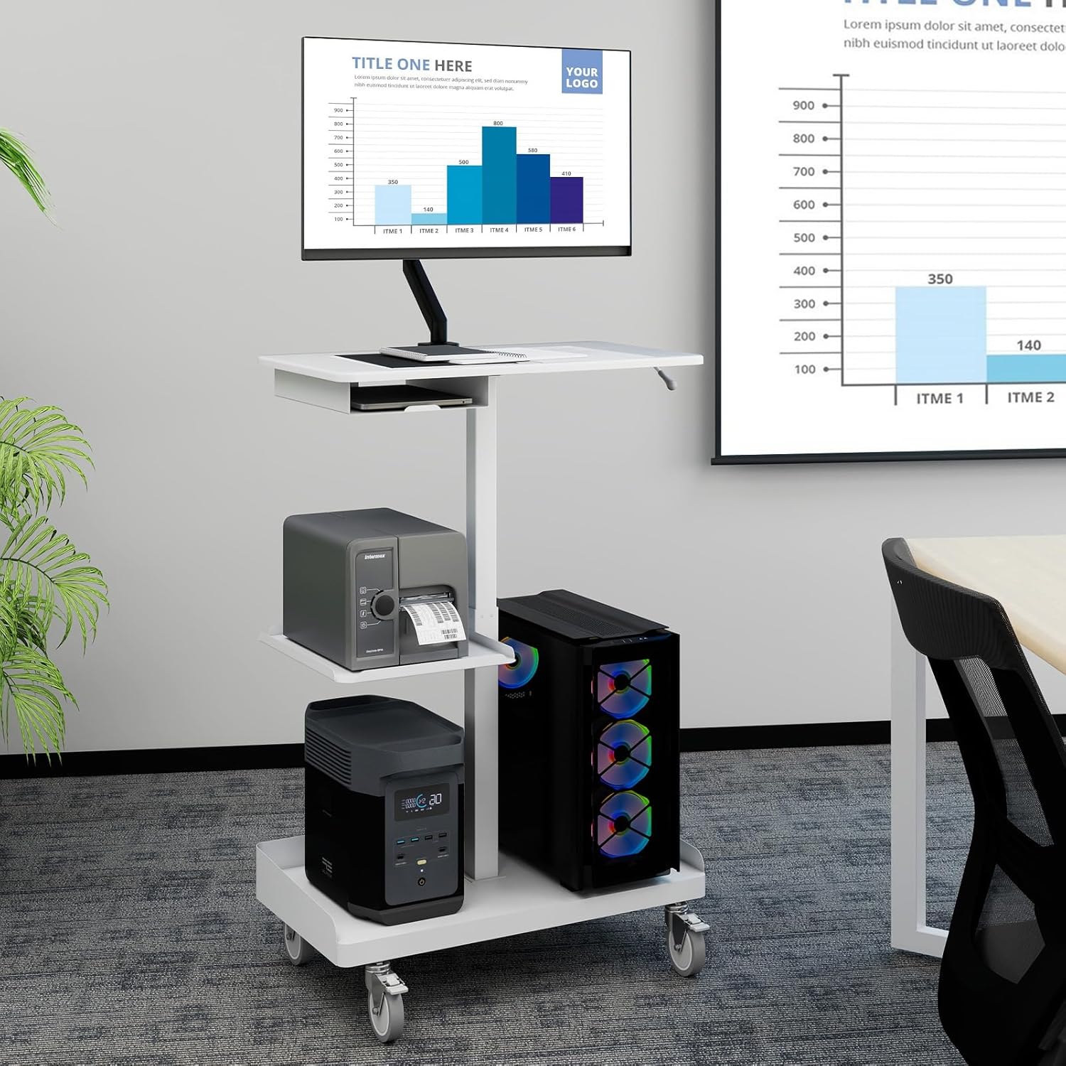 - â ăVersatile Usage Scenariosă-With a built-in monitor stand and spacious storage (fits CPU, printer, power station , and laptop), this adjustable work platform serves as a multi-functional mobile workstation, such as a standing computer desk, lecture podium, medical cart, or warehouse trolleyâideal for home offices, schools, clinics, and industrial spaces.