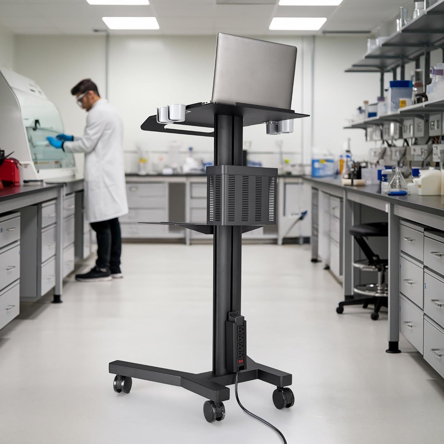- Versatile Storage Rolling Computer Stand - Includes a metal basket on the back for holding files, medicines, or small medical accessories, 2 scanner holders for storing up to 4 temperature scanners, and an extra holder for keeping the power strip in place and hassle-free