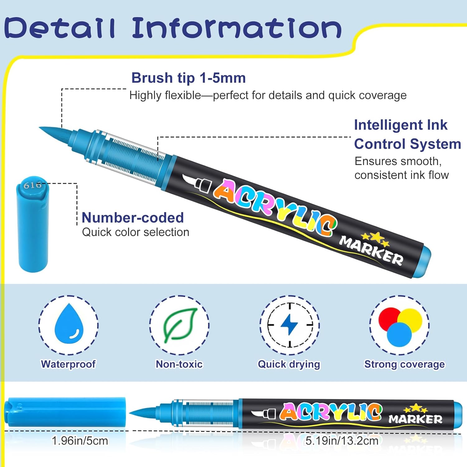 - Flexible Brush Tip Magic: The soft brush tip on these acrylic paint pens flows ink effortlessly, letting you create 1-5mm lines just by angling the pen. Perfect for outlining, filling large areas, or detailed work!