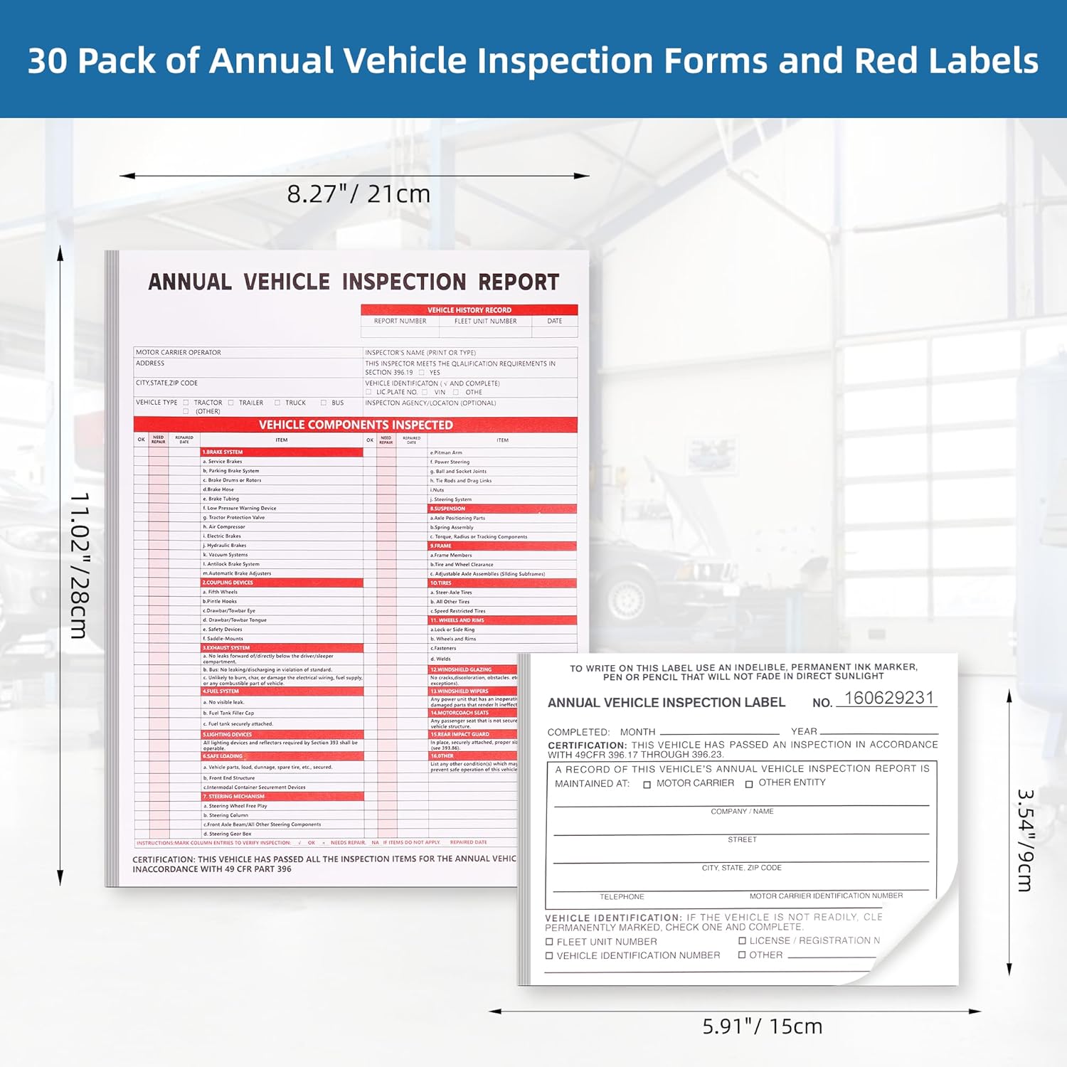 30-Pack Annual Vehicle Inspection Report Form, 3-Ply Carbonless Form and Hardboard, Includes 30-Pk 2-Ply FMCSA Vinyl Adhesive Label for Annual Inspections, DOT Compliant