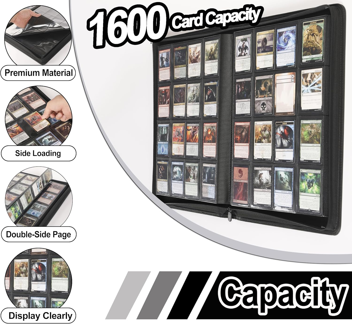 - Massive Storage Capacity - Each binder comes equipped with 25 premium double-sided sheets. Each sheet securely holds 64 cards, Our card binder 16 pocket providing a massive total capacity of 1600 cards. Effortlessly accommodates both sleeved and unsleeved cards, meeting all your high-volume storage needs.