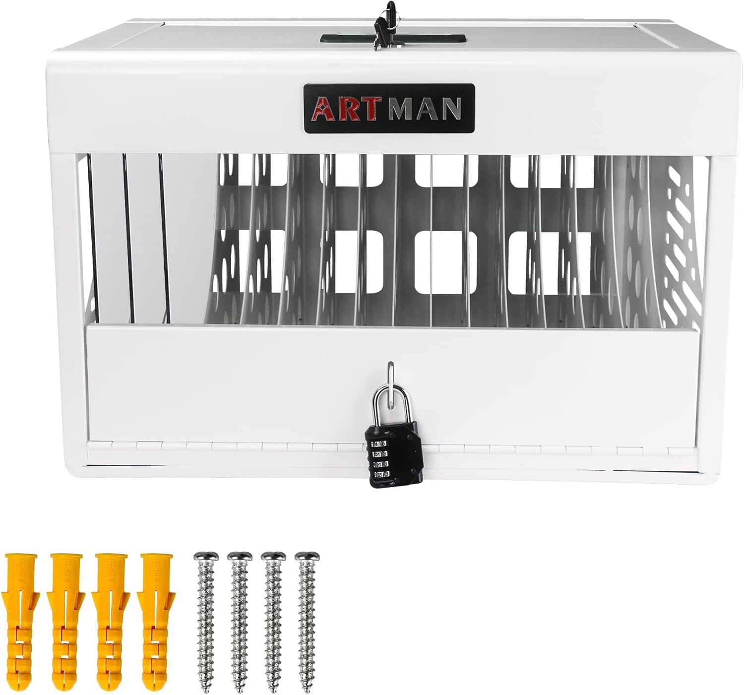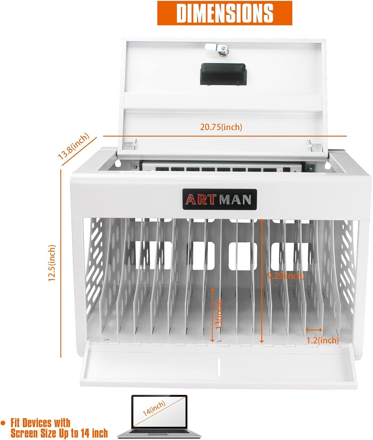- 【Widely applicable scenarios】:Our steel dividers can different types of tablets up to 1.2-inch thick and 14-inch screensize in your classroom/library/clinic/office/school and more.The tablet charging station locking cabinet can be installed on walls, or set flat on desk or table.