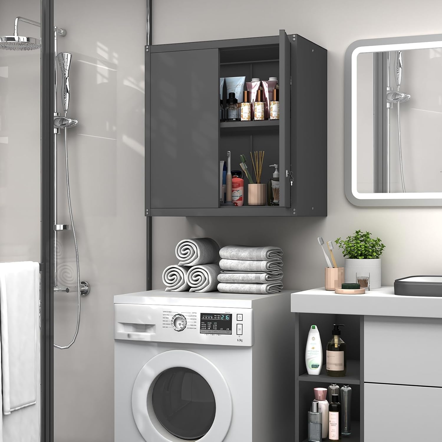 - BEARING CAPACITY - The metal wall storage cabinet has 1 adjustable shelf,which can hold up to 120lbs, allowing for a total weight capacity of 240 lbs. You can use screws to hang it on the wall to save space.