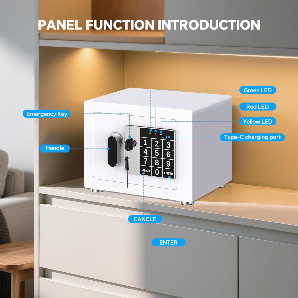 - Four Major Upgrades - Modern Electronic Safe. This safe features key enhancements: 1. A longer, more secure key (vs. old short key); 2. A built-in LED light for interior visibility; 3. Four non-slip foot pads for stability; 4. An external Type-C charging cable for convenient power.